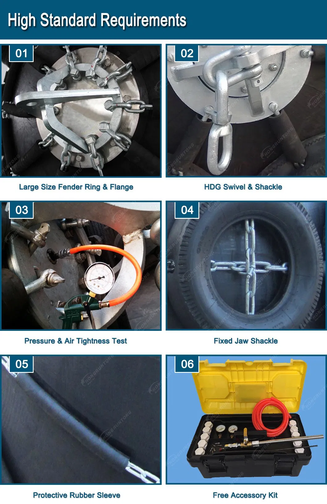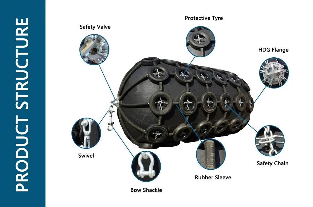 Pneumatic Fenders are ideal for permanent and semi-permanent port applications and for offshore ship-to-ship transfers. They are manufactured according to ISO17357-1:2014. Fenders are available in diameters ranging from 300 mm to 4,500 mm and lengths ranging from 500 mm to 12,000 mm, as well as special sizes.